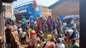 Les volontaires de la Croix-Rouge du Burundi (CRB) supervisent la distribution d’eau grâce à un camion-citerne dans la localité de Buganda, au nord-ouest du pays.